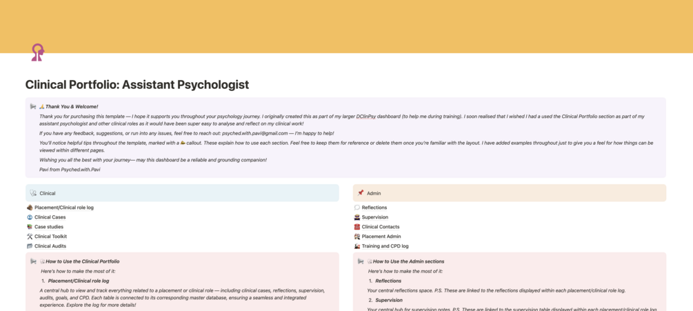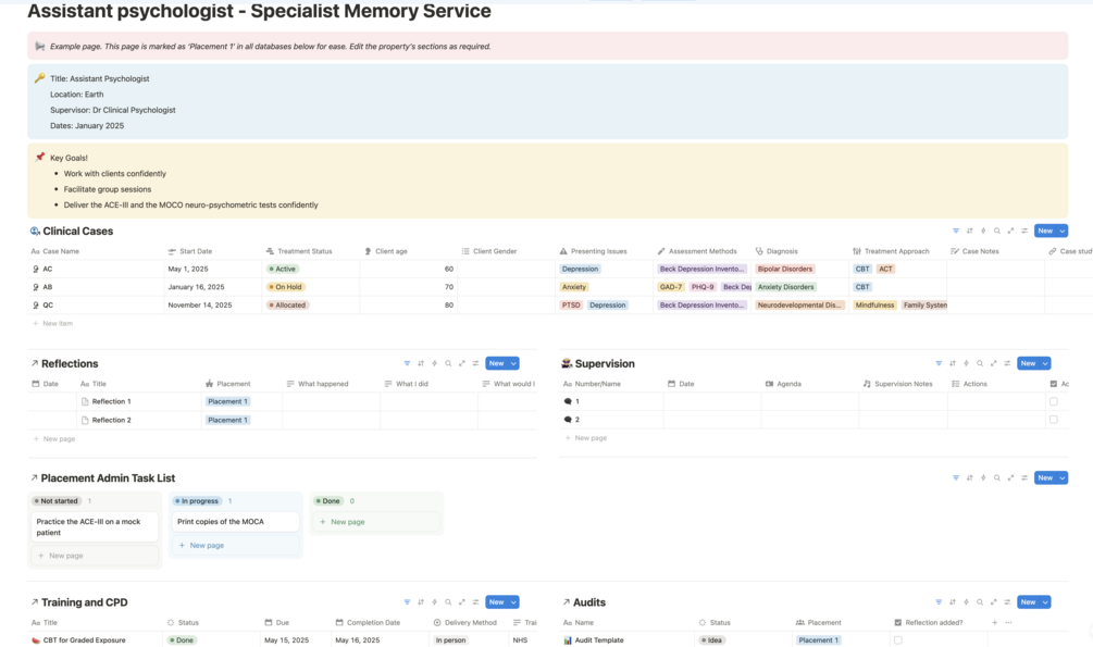 This Notion template is designed to support Assistant Psychologists and mental health professionals in tracking, reflecting on, and organising their clinical experience.