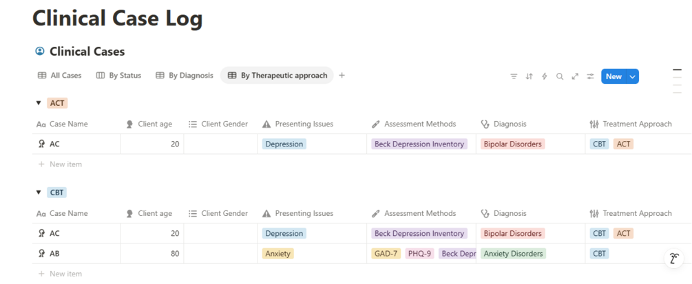 A clean, structured Notion template to help psychological professionals log, reflect on, and organise their clinical casework with confidence and ease.